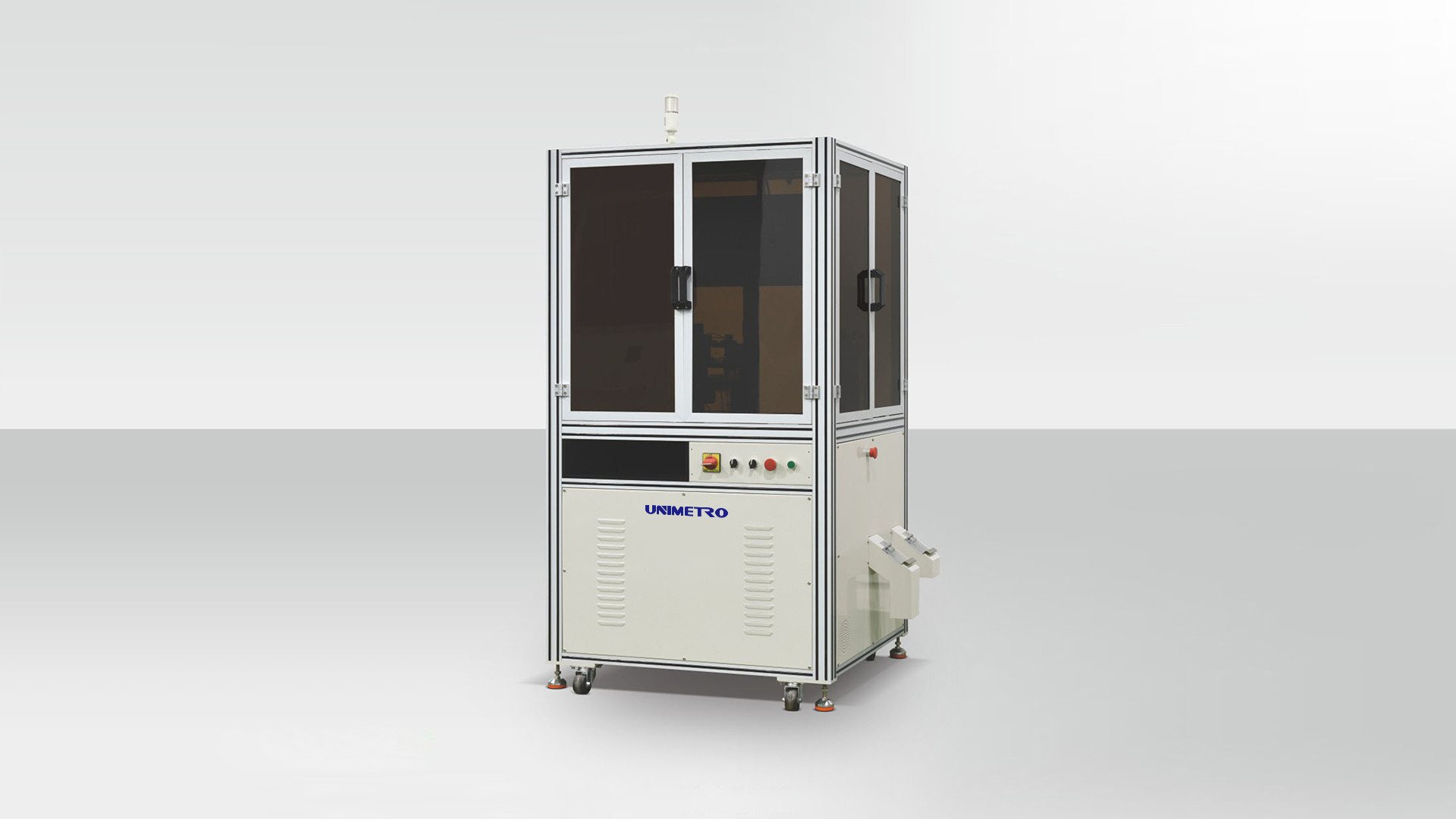 تدمج هذه المعدات الآلية عالية السرعة والدقيقة للقياس والفحص برمجيات قياس الرؤية، وكاميرا صناعية CCD، وأنظمة ميكانيكية، وحاسوب صناعي، ومكونات كهربائية، ووظائف نفخ بصمام كهرومغناطيسي. يقوم النظام تلقائيًا بنقل قطع العمل إلى محطة الكشف للتصوير عالي السرعة، ويقيم النتائج من خلال برمجيات الفحص البصري، ويفرز المنتجات إلى فئات جيدة ومعيبة باستخدام صمامات كهرومغناطيسية.